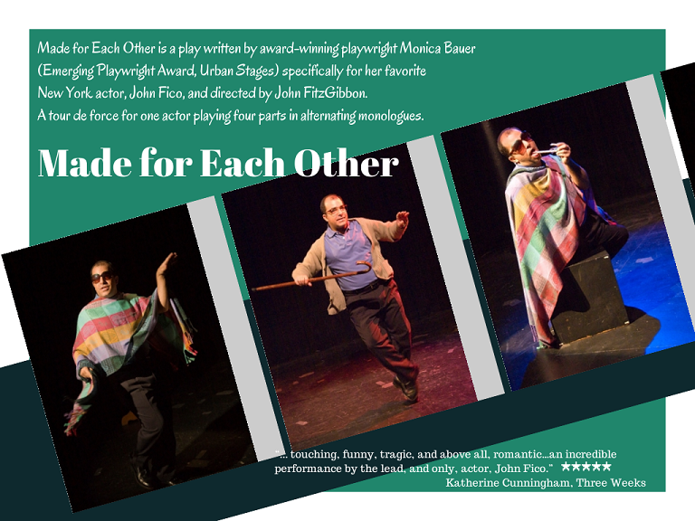 Hilariously funny and touching, the incredible actor John Fico performs in the solo show “Made For Each Other”, written by Monica Bauer and directed by John Fitz Gibbon. With a series of direct addresses to the audience, Fico takes you through the love story of Vincent, a closeted science teacher, and Jerry, a nurse who helps attends Vincent’s mom. Add in a Broadway Diva with Alzheimer’s, your favorite Italian grandfather, and a lie that might tear the two lovers apart, and you’re in for a tour de force all driven by Mr. Fico himself.